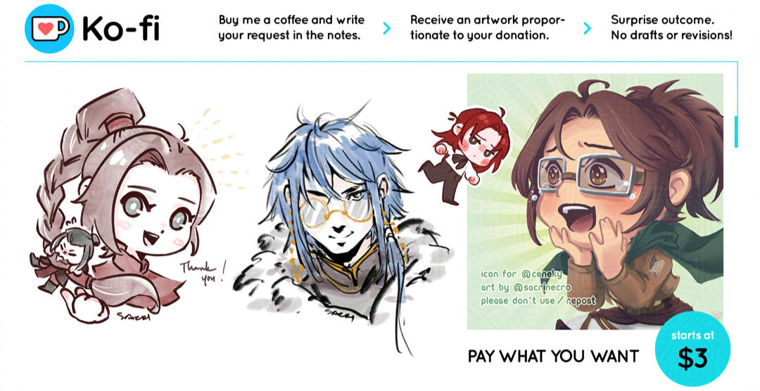 For orders below $40 (₱1,000). Full payment is required to start.For orders worth $40+. Sketching will start after payment of 50% of the commission price is confirmed. The other half must be paid after the sketch is approved. Work will proceed only after the commission is fully paid. The client may also opt to pay in full.Payments are accepted through the following channels.