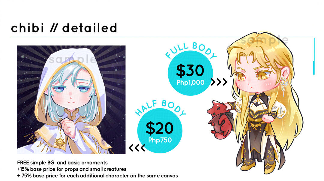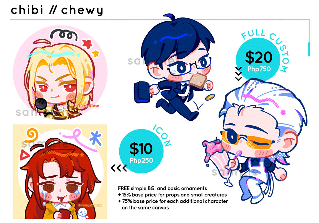 Base price. The base price typically ranges from $5 to $100 depending on complexity.Backgrounds. Plain and YCH backgrounds (flat color, gradient, preset patterns) are free. For complex backgrounds, please ask for an estimate.Physical add-ons: for PH-based clients only. Physical goods for personal use (e.g. art print, sticker flakes, memo pads, bookmarks, pin badges) may be requested in addition to chibi commissions. Click here for more info.Additional Fees. The total commission price may change based on the specifics of the request. The following fees may be charged on top of the base price, depending on complexity: