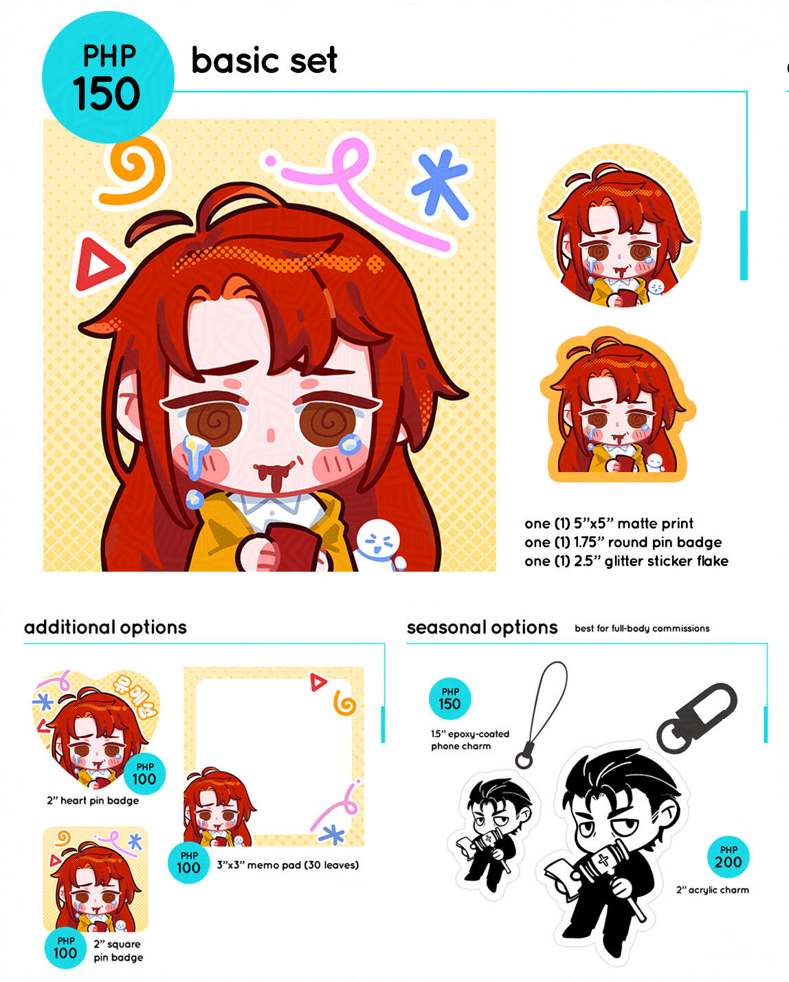 | Basic (art print, sticker flake, 44mm pin) | ₱150 |